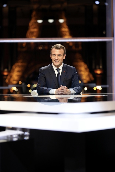 Emmanuel Macron udziela wywiadu na tle Wiezy Eiffla