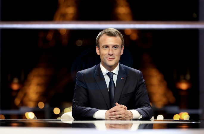 Emmanuel Macron udziela wywiadu na tle Wiezy Eiffla