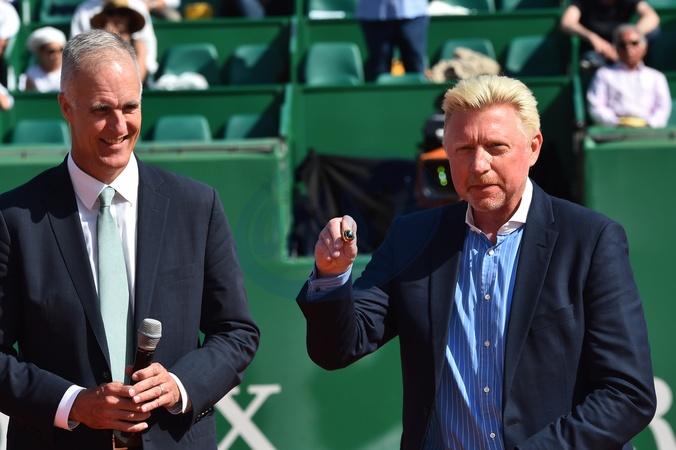 Boris Becker z plastrem na nosie chwali sie pierscieniem Hall of Fame