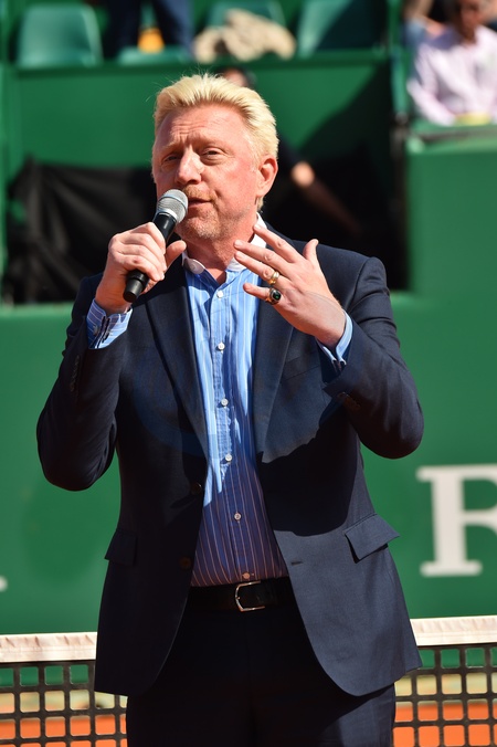 Boris Becker z plastrem na nosie chwali sie pierscieniem Hall of Fame