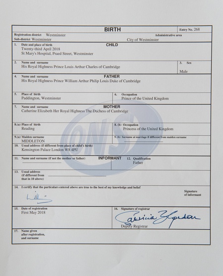 Akt urodzenia syna Kate i Williama - ksiecia Louisa