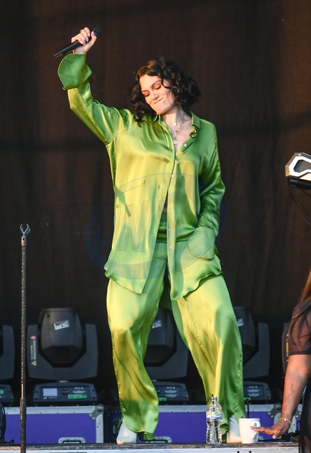 Jessie J w zielonej pizamie i w masce kota na scenie