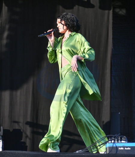 Jessie J w zielonej pizamie i w masce kota na scenie