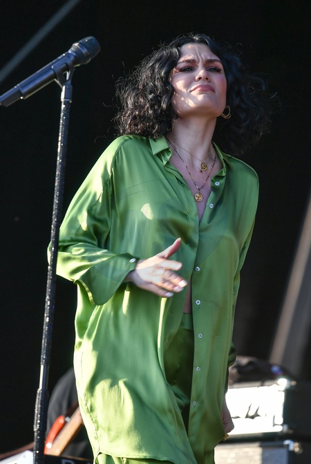 Jessie J w zielonej pizamie i w masce kota na scenie