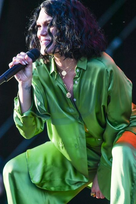 Jessie J w zielonej pizamie i w masce kota na scenie