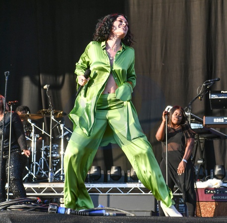 Jessie J w zielonej pizamie i w masce kota na scenie