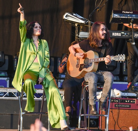 Jessie J w zielonej pizamie i w masce kota na scenie