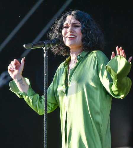 Jessie J w zielonej pizamie i w masce kota na scenie