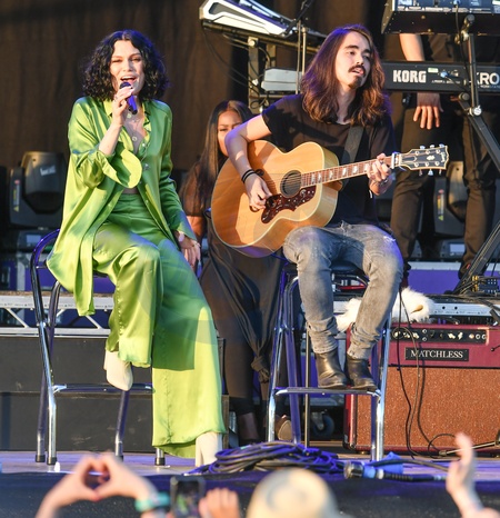 Jessie J w zielonej pizamie i w masce kota na scenie