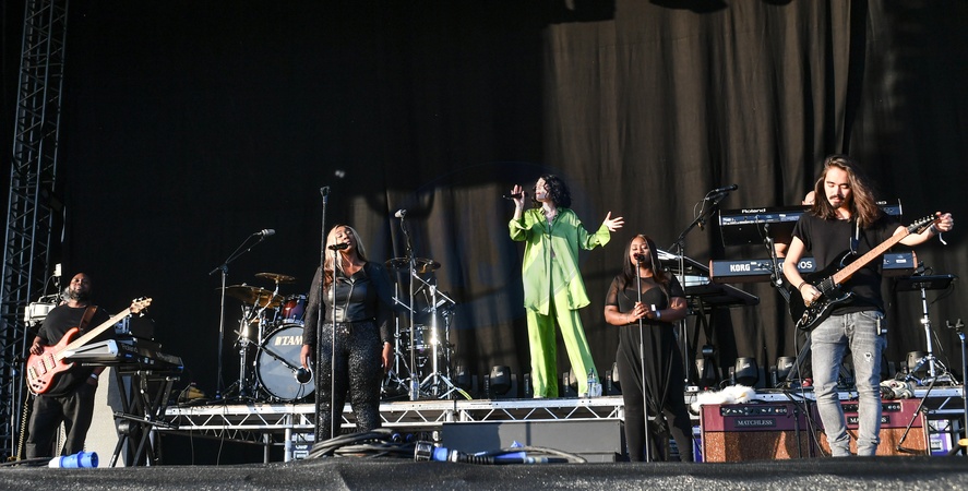 Jessie J w zielonej pizamie i w masce kota na scenie