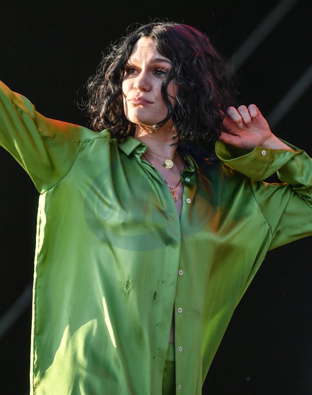 Jessie J w zielonej pizamie i w masce kota na scenie