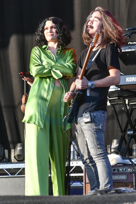 Jessie J w zielonej pizamie i w masce kota na scenie