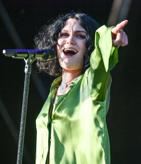 Jessie J w zielonej pizamie i w masce kota na scenie