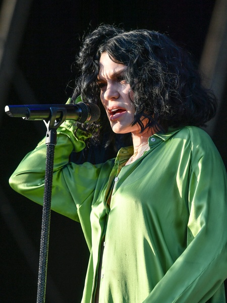 Jessie J w zielonej pizamie i w masce kota na scenie
