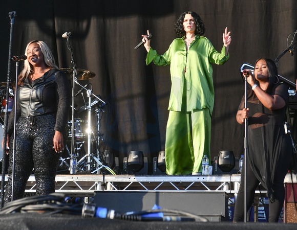 Jessie J w zielonej pizamie i w masce kota na scenie
