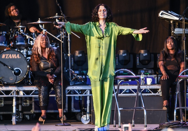 Jessie J w zielonej pizamie i w masce kota na scenie