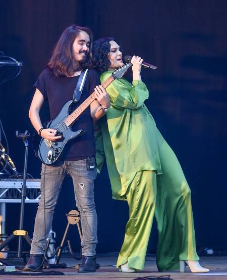 Jessie J w zielonej pizamie i w masce kota na scenie