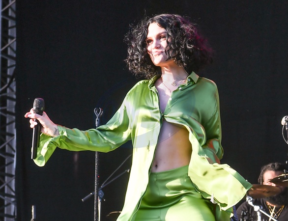 Jessie J w zielonej pizamie i w masce kota na scenie