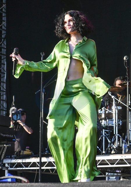 Jessie J w zielonej pizamie i w masce kota na scenie