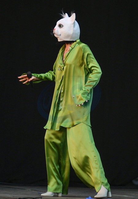 Jessie J w zielonej pizamie i w masce kota na scenie