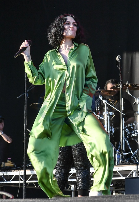 Jessie J w zielonej pizamie i w masce kota na scenie