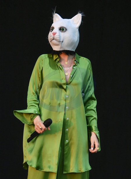 Jessie J w zielonej pizamie i w masce kota na scenie