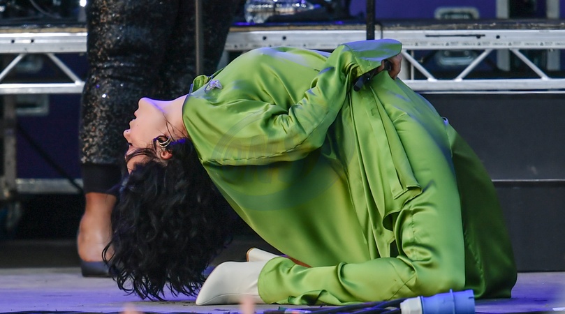 Jessie J w zielonej pizamie i w masce kota na scenie