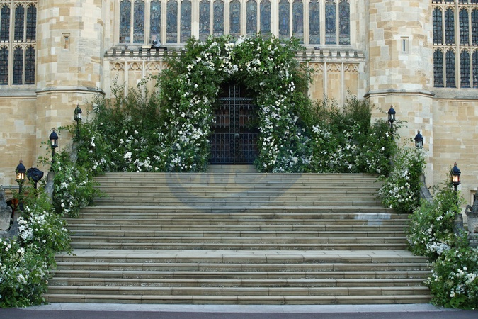 Kaplica St George's ozdobiona kwiatami na slub Harrego i Meghan Markle