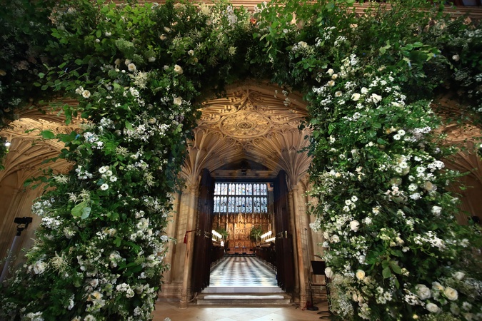 Kaplica St George's ozdobiona kwiatami na slub Harrego i Meghan Markle