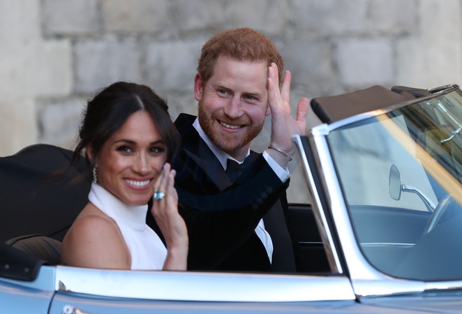 Ksiaze Harry i Meghan Markle - juz przebrani w drodze na przyjecie weselne