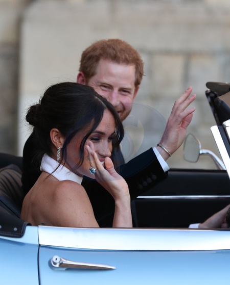 Ksiaze Harry i Meghan Markle - juz przebrani w drodze na przyjecie weselne
