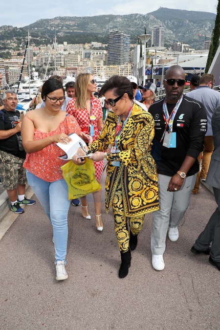 Kris Jenner we wzorzystym, zoltym kostiumie na Grand Prix of Monaco