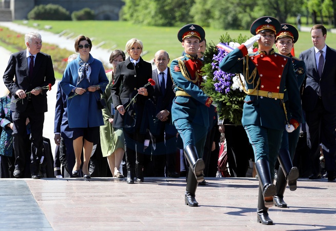 Emmanuel i Brigitte Macron zlozyli kwiaty przed pomnikiem Motherland w San Peterburgu