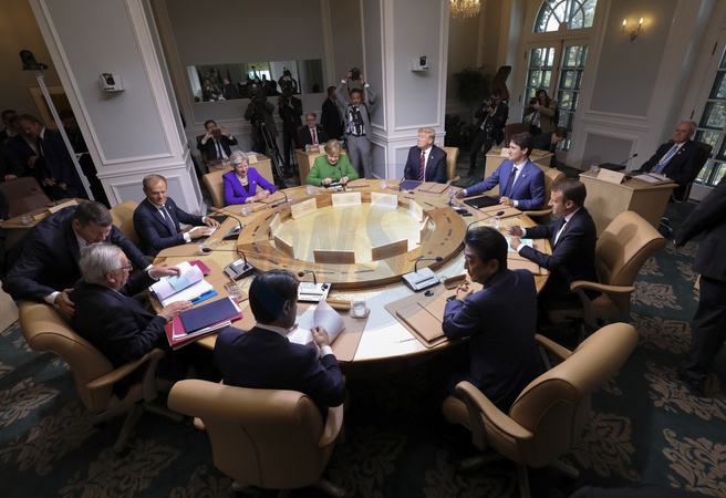 Angela Merkel, Donald Trump, Justin Trudeau, Emmanuel Macron, Shinzo Abe, Giuseppe Conte, Jean-Claude Juncker, Donald Tusk, Theresa May