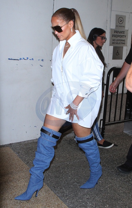 Jennifer Lopez w bialej koszuli i jeansowych kozakach