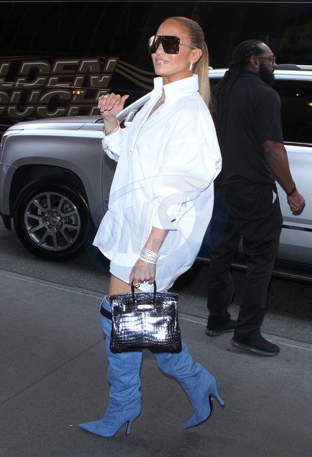 Jennifer Lopez w bialej koszuli i jeansowych kozakach
