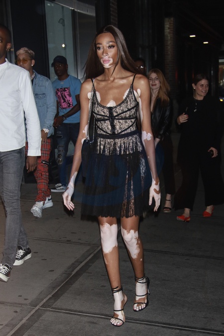 Winnie Harlow w koronkowej sukience na ramiaczka