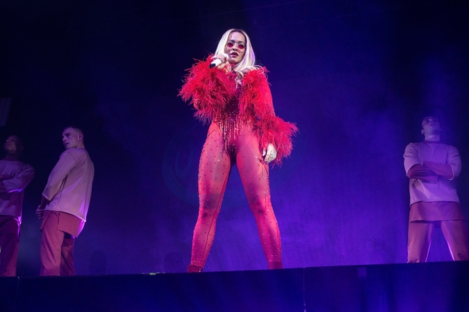 Rita Ora na scenie w czerwonym kombinezonie z pierzastymi rekawami