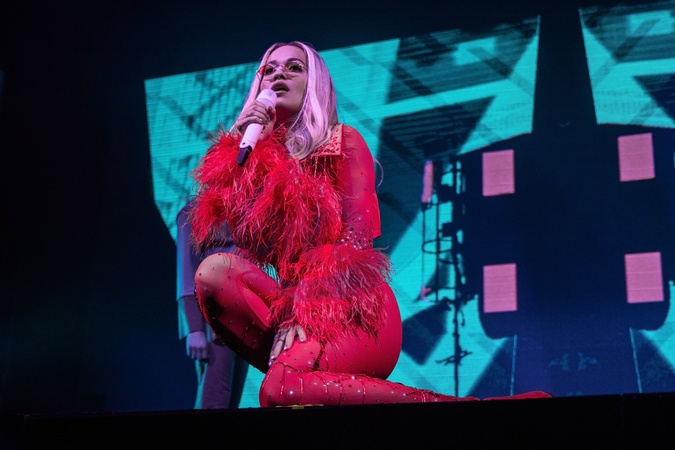 Rita Ora na scenie w czerwonym kombinezonie z pierzastymi rekawami