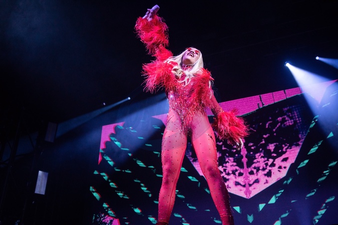 Rita Ora na scenie w czerwonym kombinezonie z pierzastymi rekawami