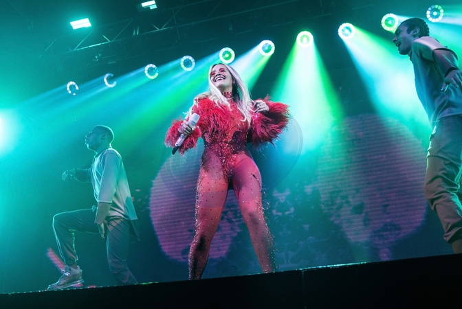 Rita Ora na scenie w czerwonym kombinezonie z pierzastymi rekawami