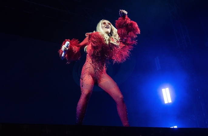 Rita Ora na scenie w czerwonym kombinezonie z pierzastymi rekawami