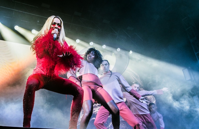 Rita Ora na scenie w czerwonym kombinezonie z pierzastymi rekawami