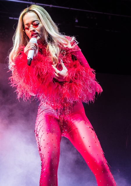 Rita Ora na scenie w czerwonym kombinezonie z pierzastymi rekawami