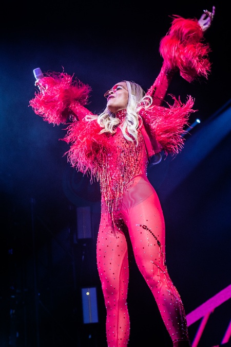 Rita Ora na scenie w czerwonym kombinezonie z pierzastymi rekawami