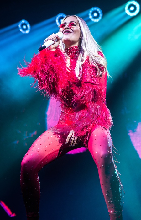 Rita Ora na scenie w czerwonym kombinezonie z pierzastymi rekawami