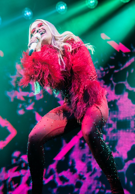 Rita Ora na scenie w czerwonym kombinezonie z pierzastymi rekawami