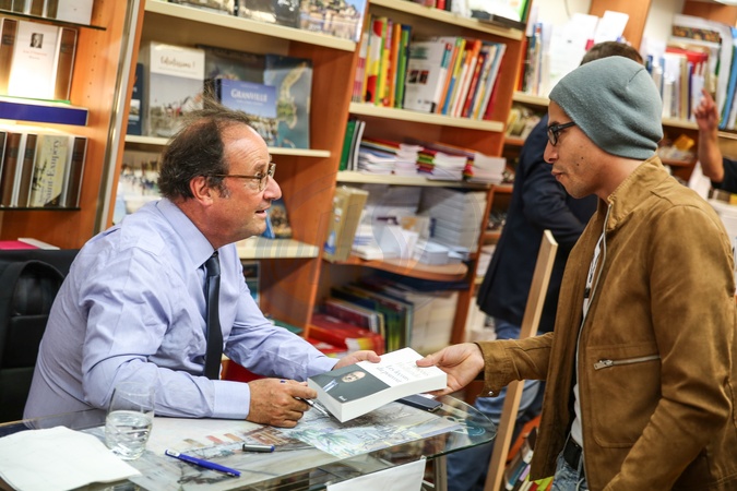 Francois Hollande i Julie Gayet na promocji ksiazki The lessons of power