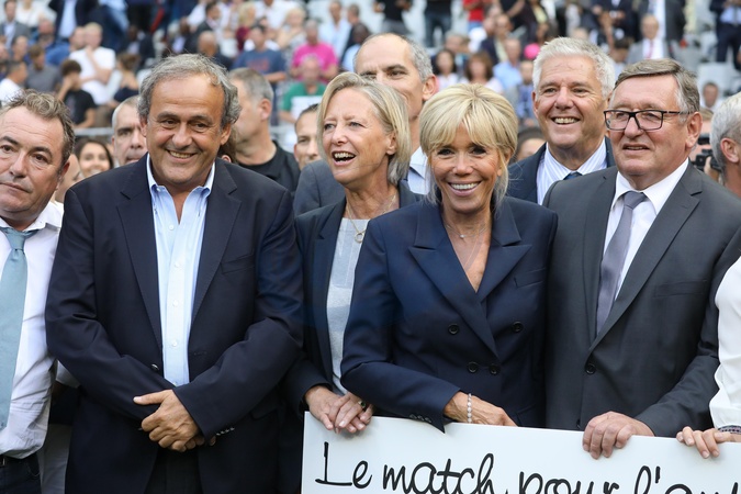 Brigitte Macron w czarnym garniturze i butach sportowych na Stade de France