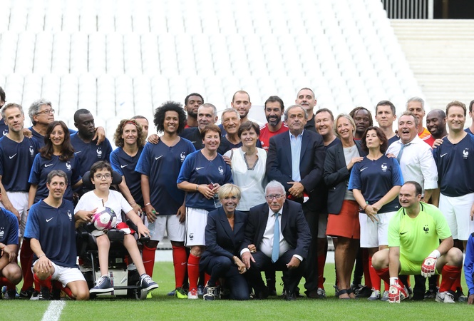 Brigitte Macron w czarnym garniturze i butach sportowych na Stade de France